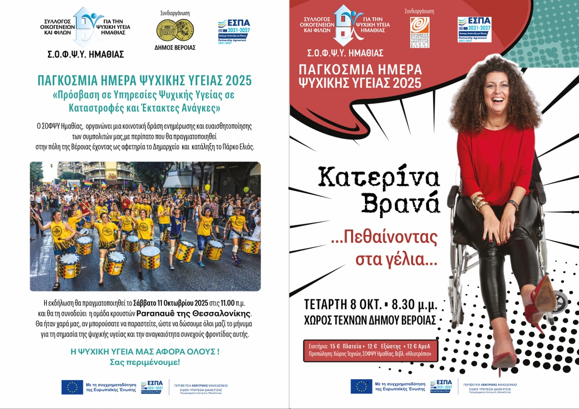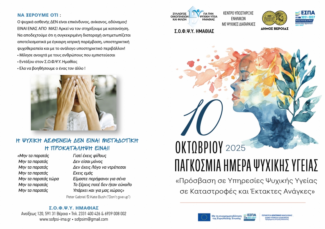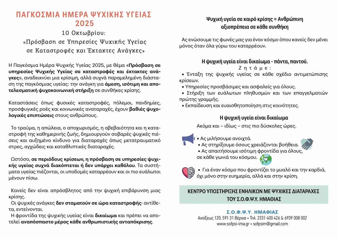 Παγκόσμια ημέρα ψυχικής υγείας 2025 17 Σεπτεμβρίου 2025 Εμφανίσεις: 64 Share: Facebook Twitter Google+ Προηγούμενο Επόμενο